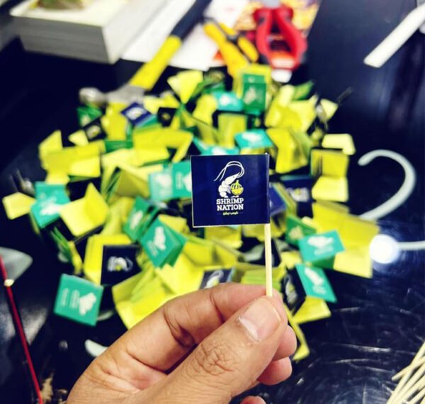 تغريسات للأكل مناسبة للمناسبات والحفلات، منفذة بأعواد الخشب مع طباعة التصميم على ستيكر ورقي على الجهتين